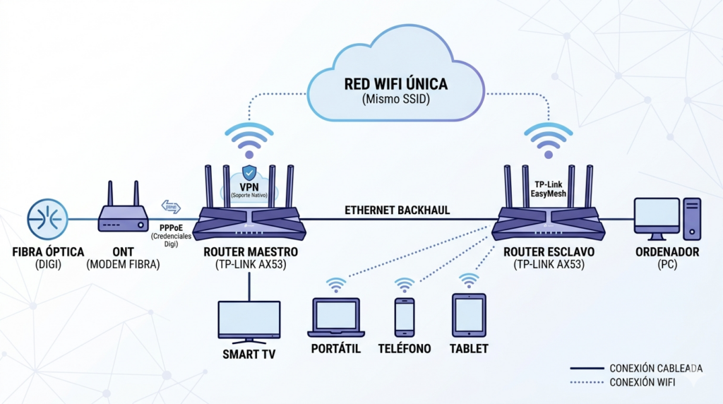 El problema viene de la configuración actual con Digi: tenemos dos routers TP-Link AX53 conectados mediante Ethernet backhaul para que el wifi llegue a todos los rincones de la casa, y haya un router con salidas ethernet en el despacho. Uno de ellos está puesto en modo maestro y otro esclavo usando EasyMesh. Es el router maestro el que tiene conectado en el puerto WAN la ONT de fibra de Digi. Para tener Internet, en su momento sólo fue necesario escribir a Digi para pedir las credenciales PPPoE y retirar el router predeterminado de Digi.