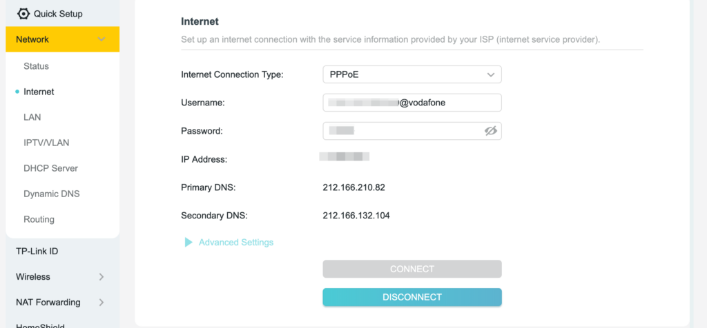 En el router de TP-Link he modificado tres cosas: Usuario PPPoE, contraseña PPPoE y VLAN (en mi caso la 100).
