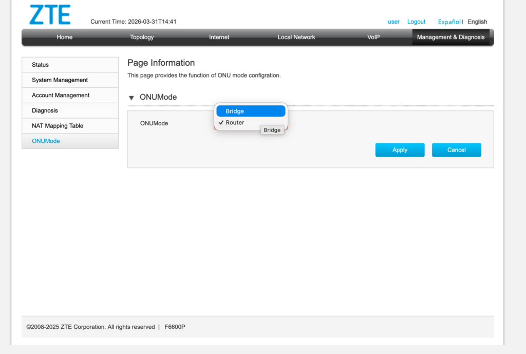 Esta sensación inicial me hace bloquear y pensar que no va a ser posible, pero al meterme en el router veo que el modo bridge se puede activar. Así que… ¡manos a la obra!: activo ese modo y saco un latiguillo Ethernet del puerto 1 del ZTE al puerto WAN de mi TP-Link.